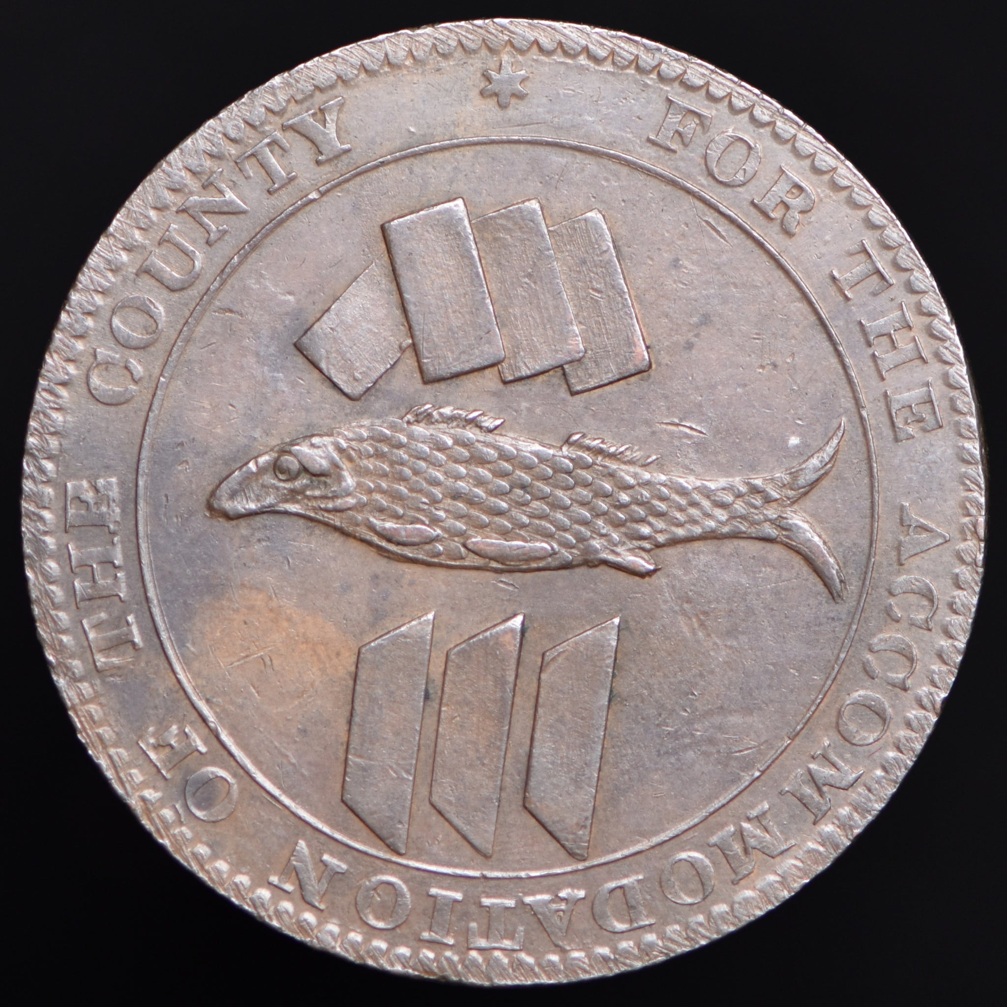 Obv: A pumping engine and winding machine in center circle, 1811 below, CORNISH PENNY around, 2 stars on either side. Rev: A fish with tin ingots, FOR THE ACCOMODATION OF THE COUNTY around. Edge: Milled.