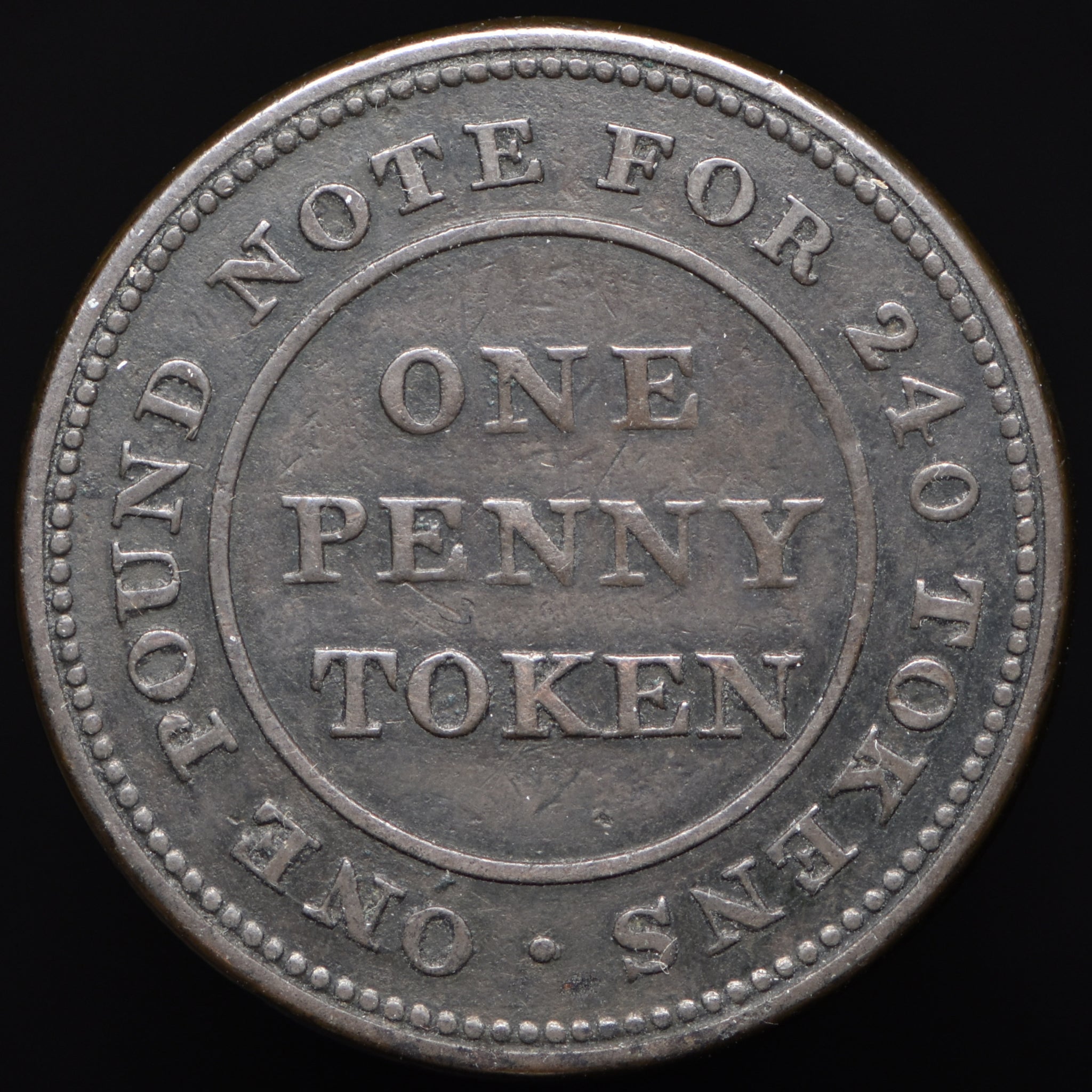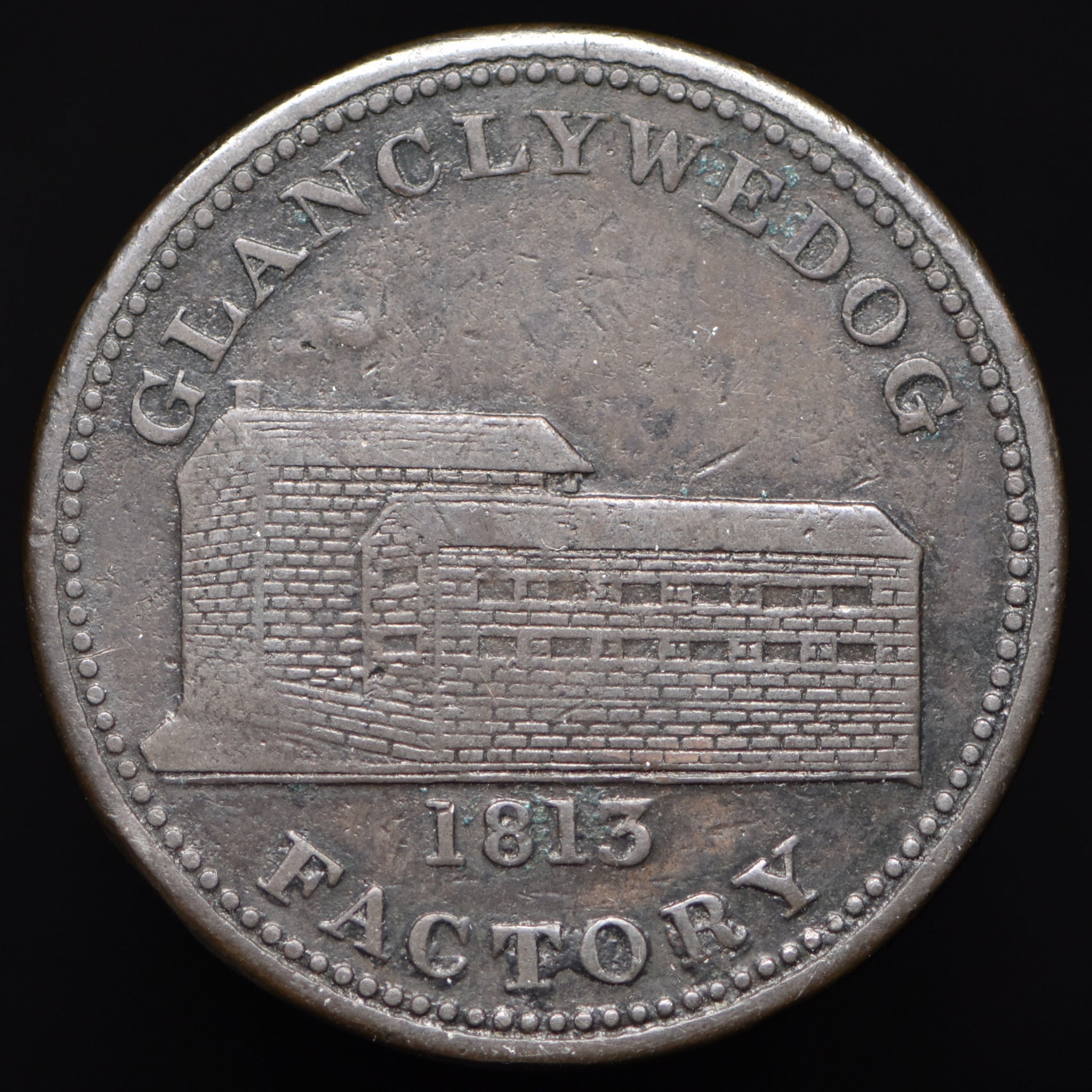 Obv: View of factory buildings, GLANCLYWEDOG above, FACTORY below, 1813 below factory. Rev: ONE PENNY TOKEN in center circle, ONE POUND NOTE FOR 240 TOKENS around. Edge: Center grained.