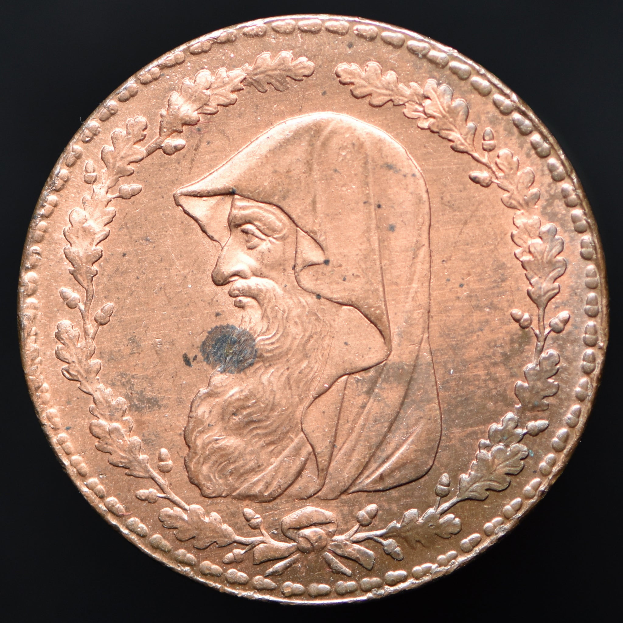 Uncirculated and almost full blazing red mint color. A professionally conserved example from the 2024 Noonan’s hoard of Anglesey tokens. Acquired from Jerry Bobbe as part of a much larger group. A token that was once listed as Extremely Rare (RRR), but now lists as Common. However, the stunning original color of these Druid penny tokens makes them a must have for the serious collector, in my opinion. This example shows some staining that remains post conservation.