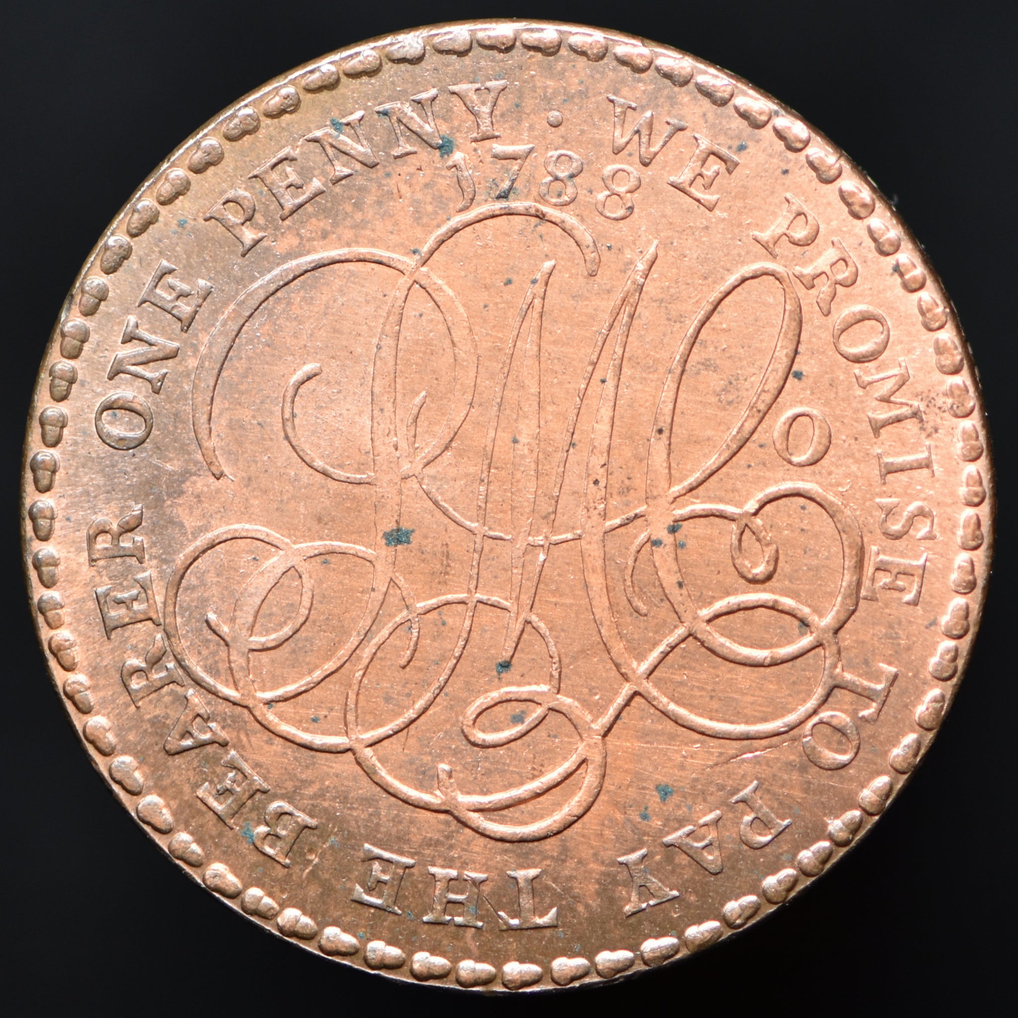 Obv: A Druid’s bust facing left, surrounded by oaken wreath with 17 acorns. Rev: A cypher P M Co, 1788 above, WE PROMISE TO PAY THE BEARER ONE PENNY around. Edge: ON DEMAND IN LONDON LIVERPOOL OR ANGLESEY.