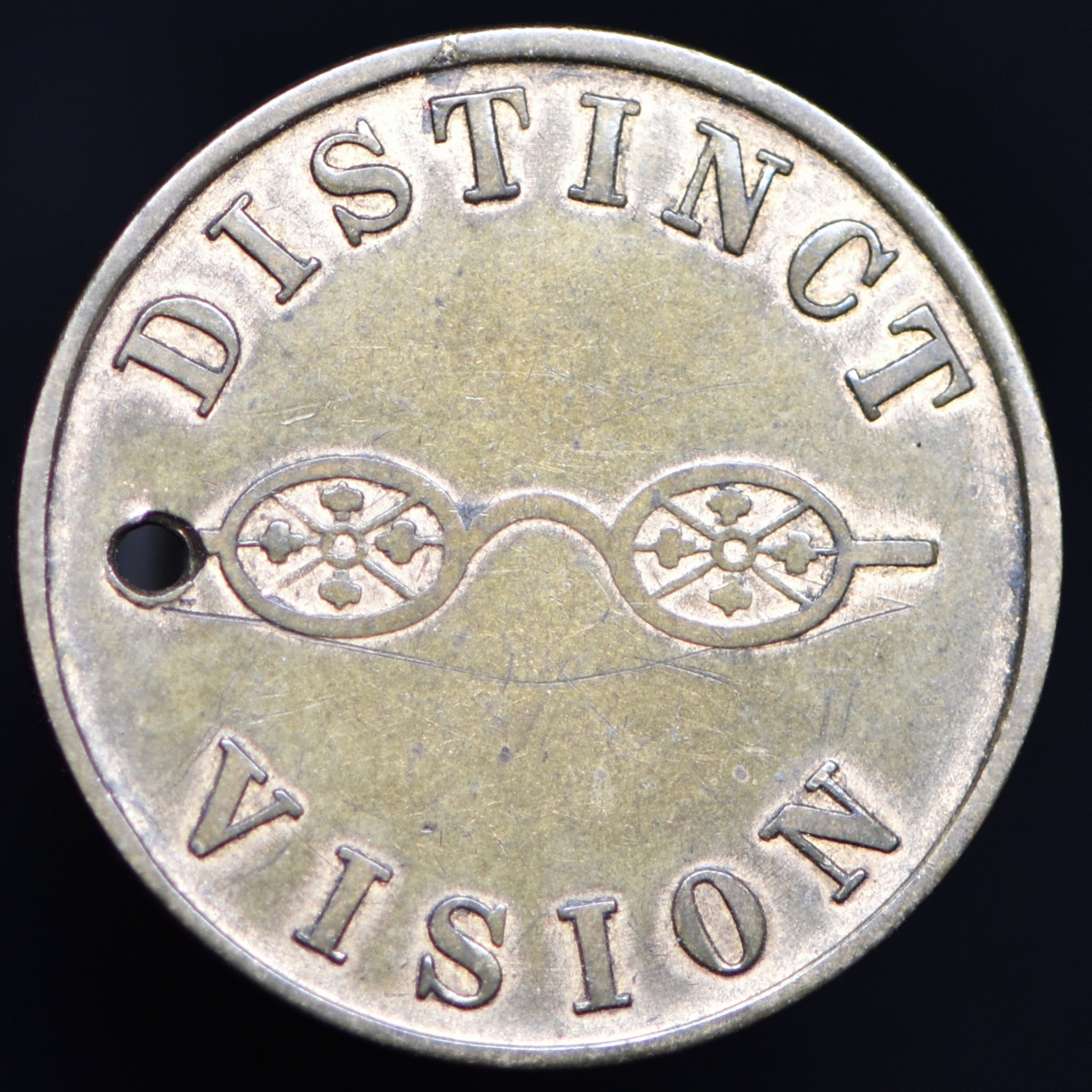 Obv: 41 BULL STREET in center circle in two lines, last line curved, J. GARGORY above, BIRMINGHAM below. Rev: Pair of spectacles, DISTINCT VISION around. Edge: Plain.