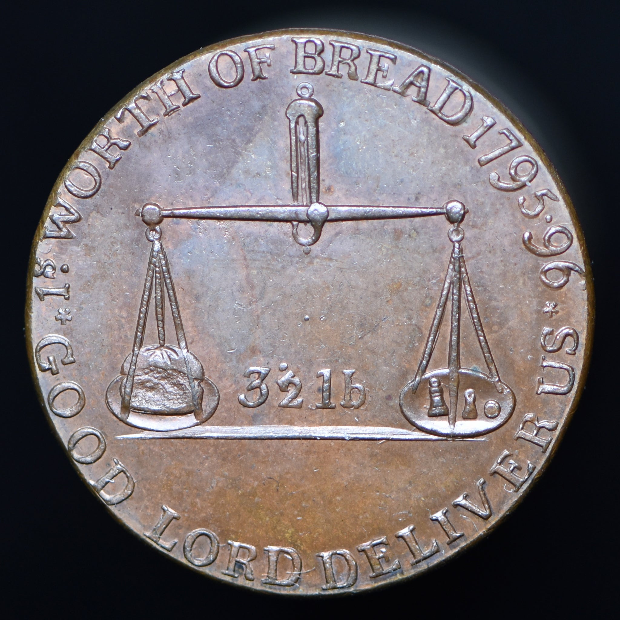Obv: Pair of scales, 3/12 lb between, 1S. WORTH OF BREAD 1795.96 above, GOOD LORD DELIVER US below. Rev: Pair of scales, 6 ½ lb between, BREAD FOR 1S. APRIL 1796 above, GOD BE PRAISED below. Edge: Plain.