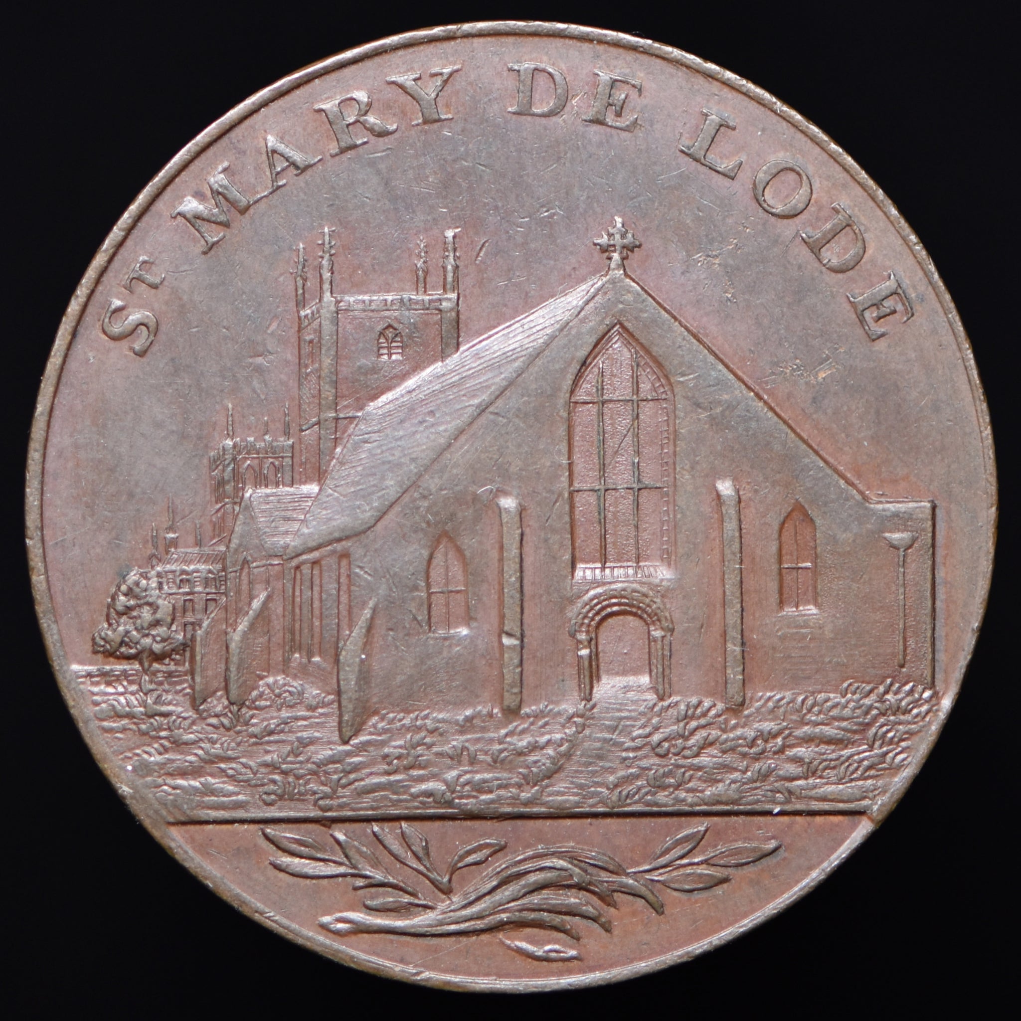 Obv: View of Church, ST. MARY DE LODE above, laurel branches in exergue. Rev: Shield of arms, cap of maintenance as crest, THE ARMS OF GLOCESTER . CITY TOKEN  around, 1797 below. Edge: Plain.