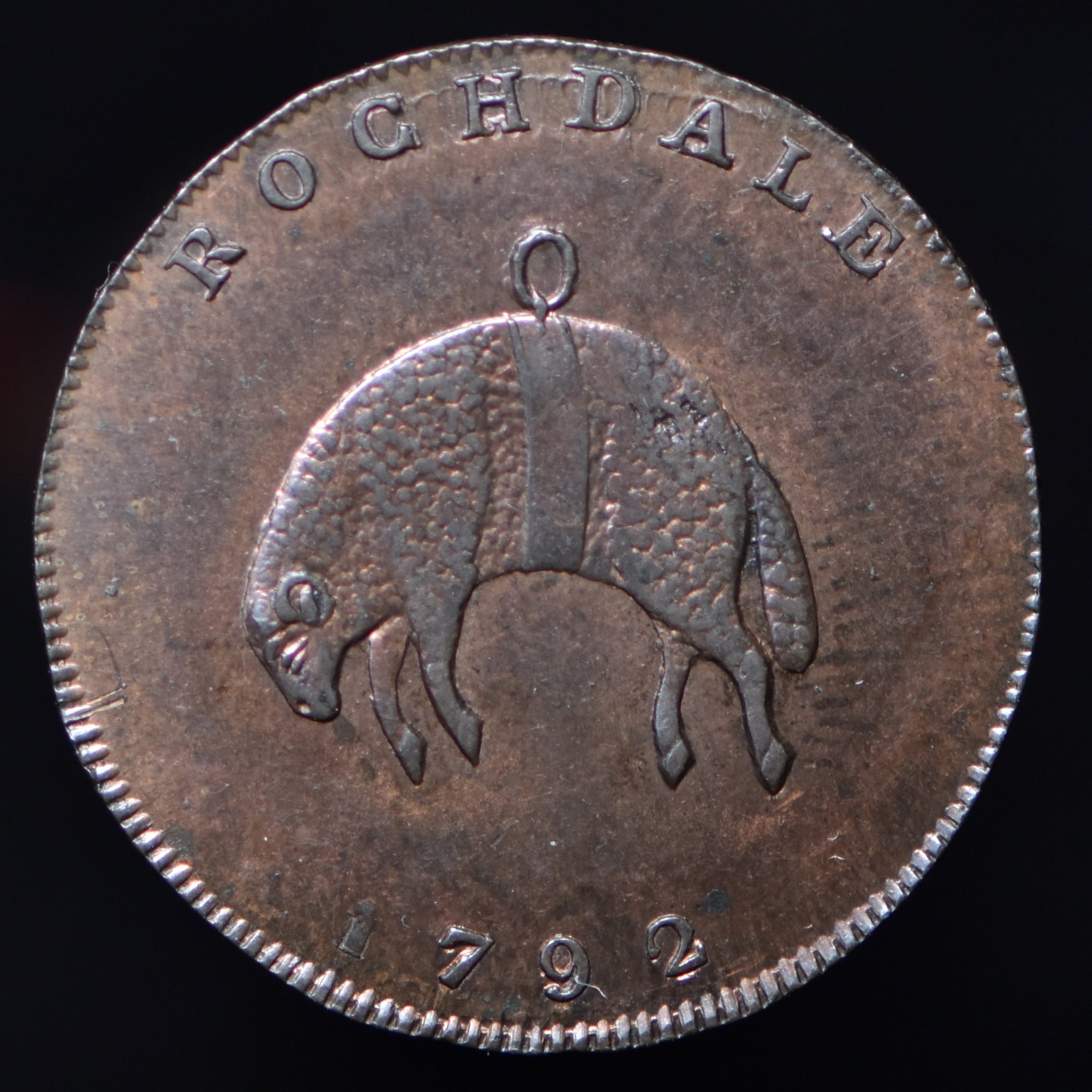 Obv: Man in a loom, HALF HALFPENNY above. Rev: Hanging fleece, ROCHDALE above, 1792 below. Edge: Milled.