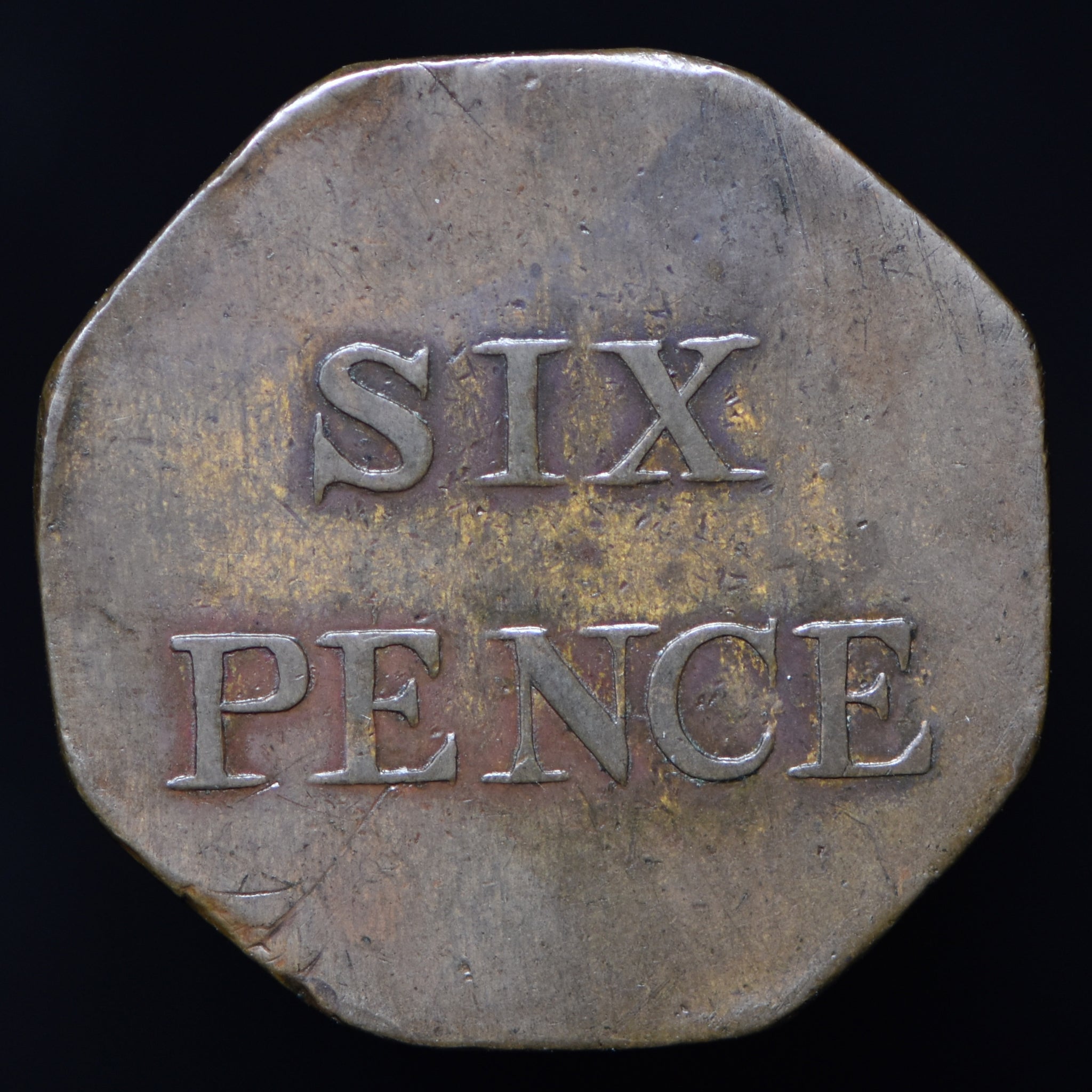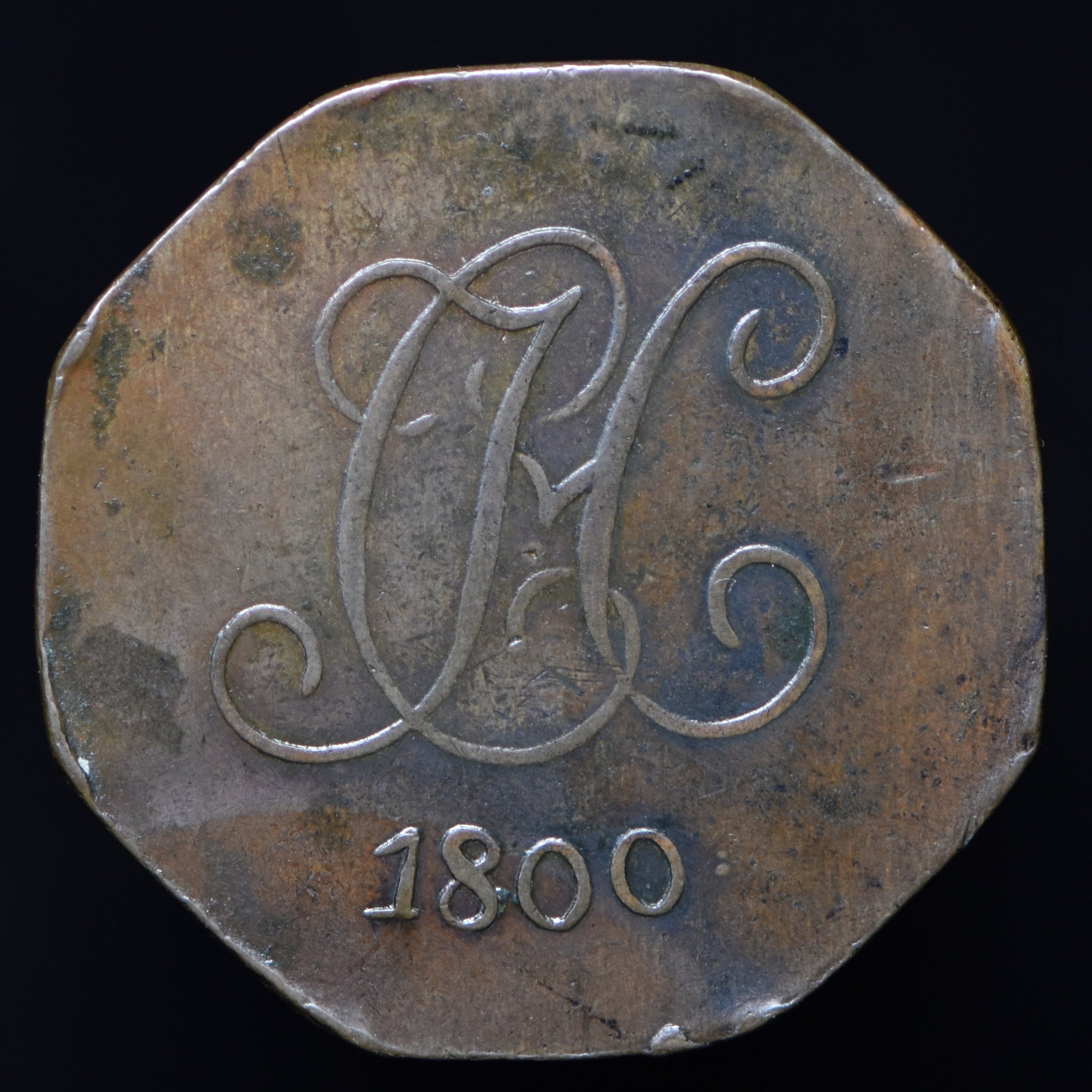 Obv: A monogram cypher C H, 1800 below, followed by a period. Rev: SIX PENCE in two lines. Edge: Plain. Struck on octagonal flan.