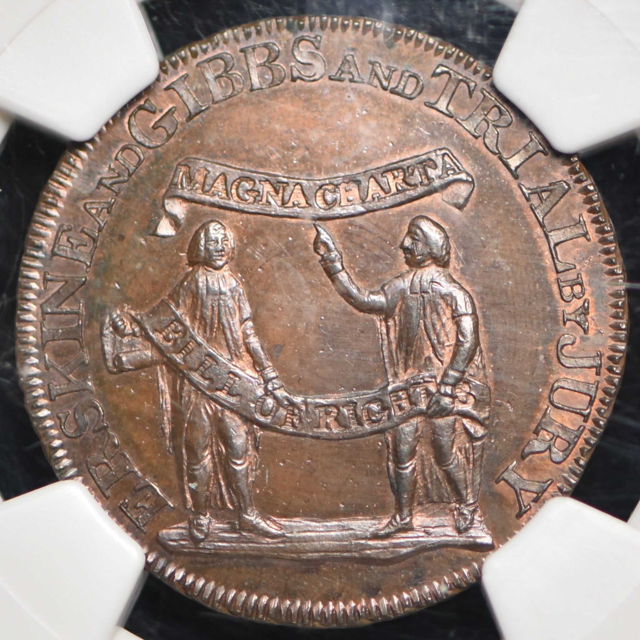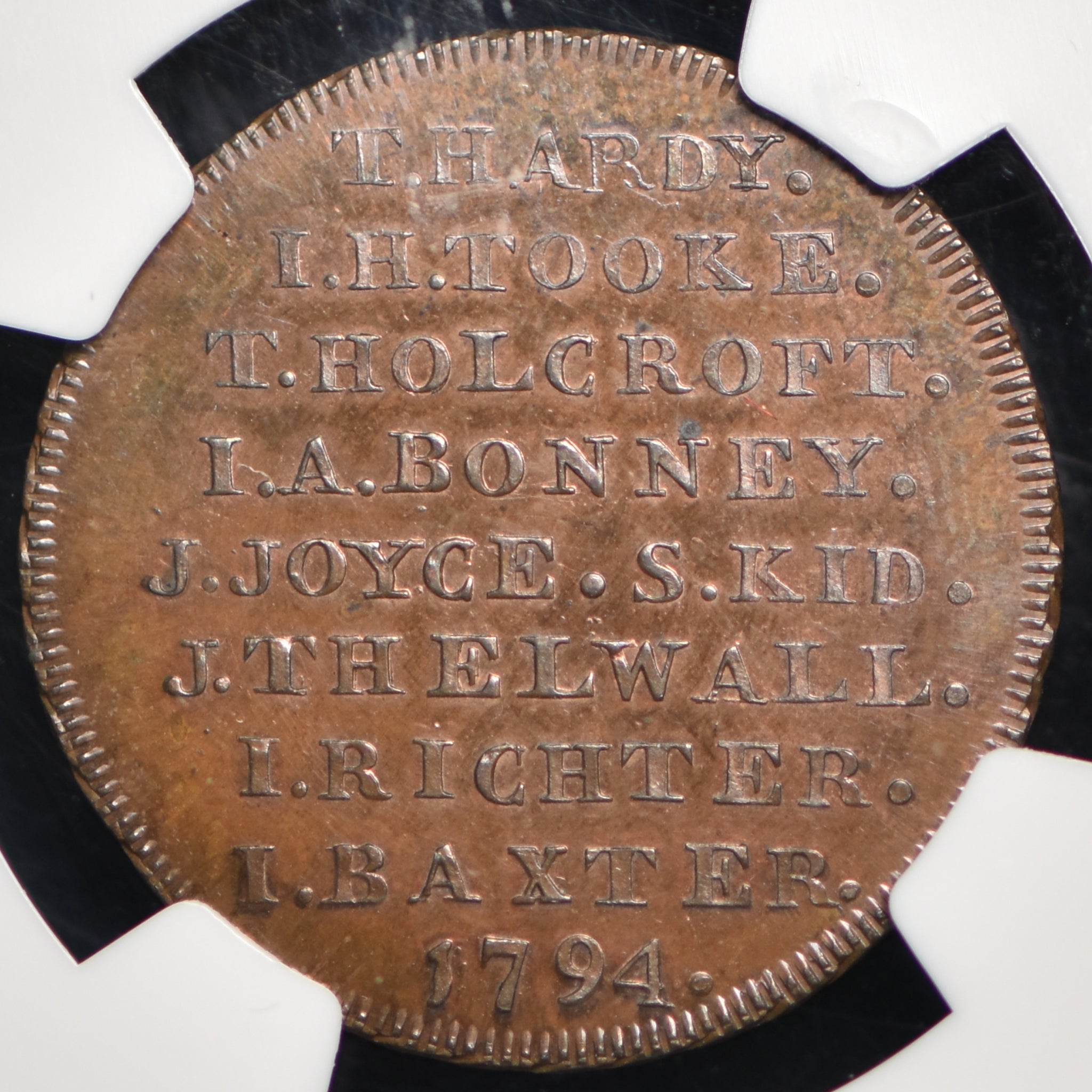Obv: Two barristers standing, holding a banner which reads BILL OF RIGHTS, banner above them reads MAGNA CHARTA, ERSKINE AND GIBBS AND TRIAL BY JURY around. Rev: T. HARDY I.H. TOOKE. T. HOLCROFT. I.A. BONNEY. J. JOYCE. S. KID. J THELWALL. I. RICHTER. I. BAXTER. 1794. (In nine lines). Edge: Engrailed.