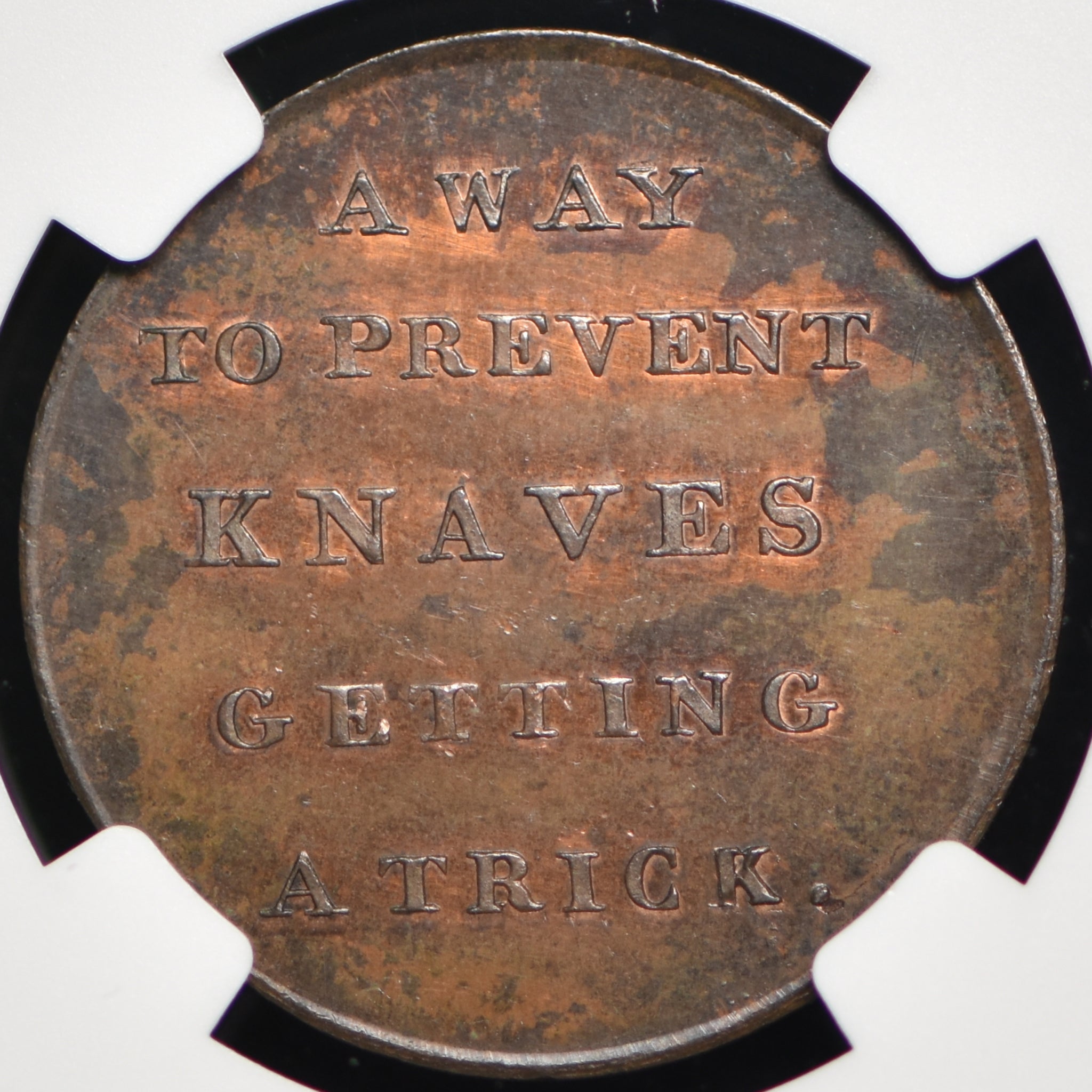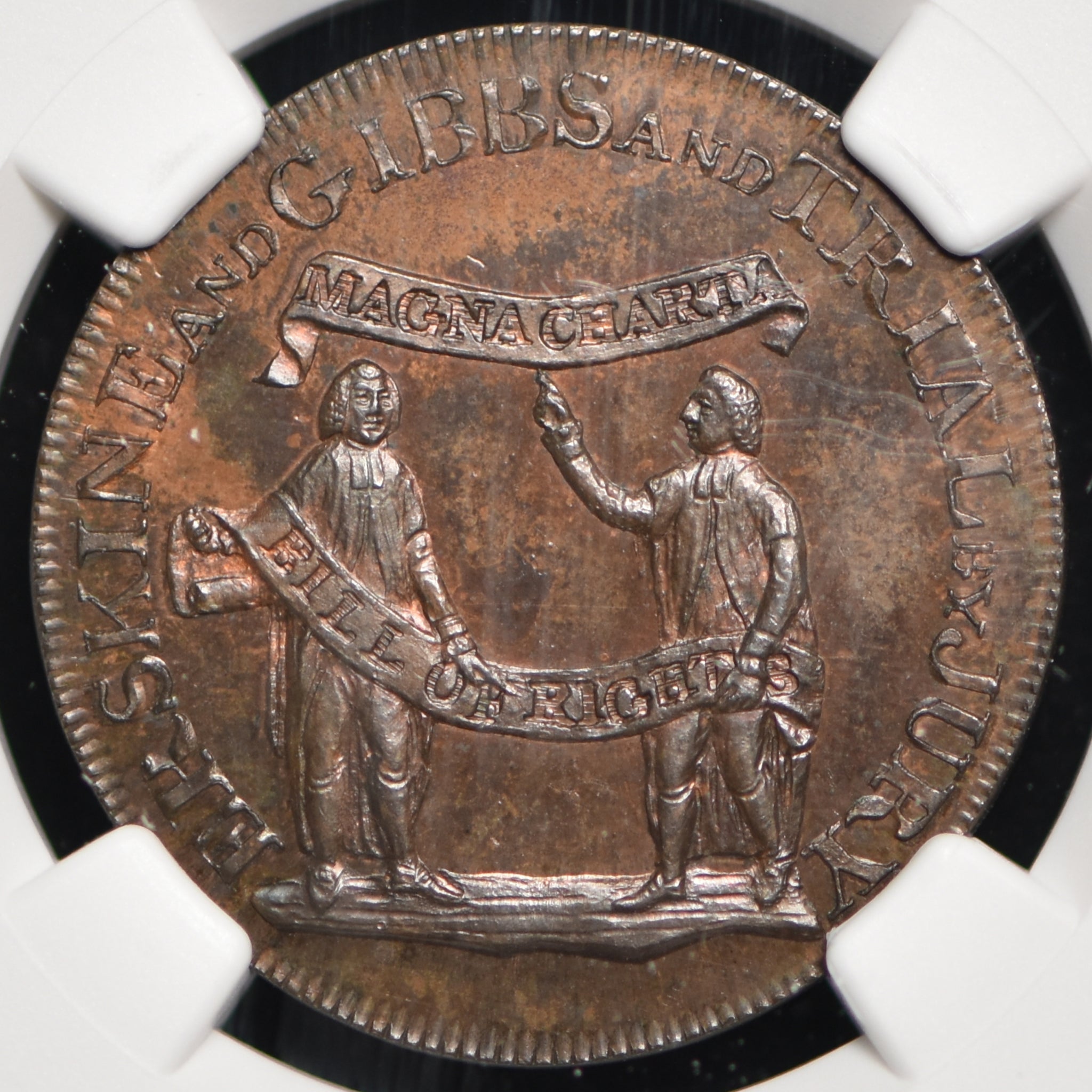 Obv: Two barristers standing, holding a banner which reads BILL OF RIGHTS, banner above them reads MAGNA CHARTA, ERSKINE AND GIBBS AND TRIAL BY JURY around. Rev: A WAY TO PREVENT KNAVES GETTING A TRICK. Edge: Plain.