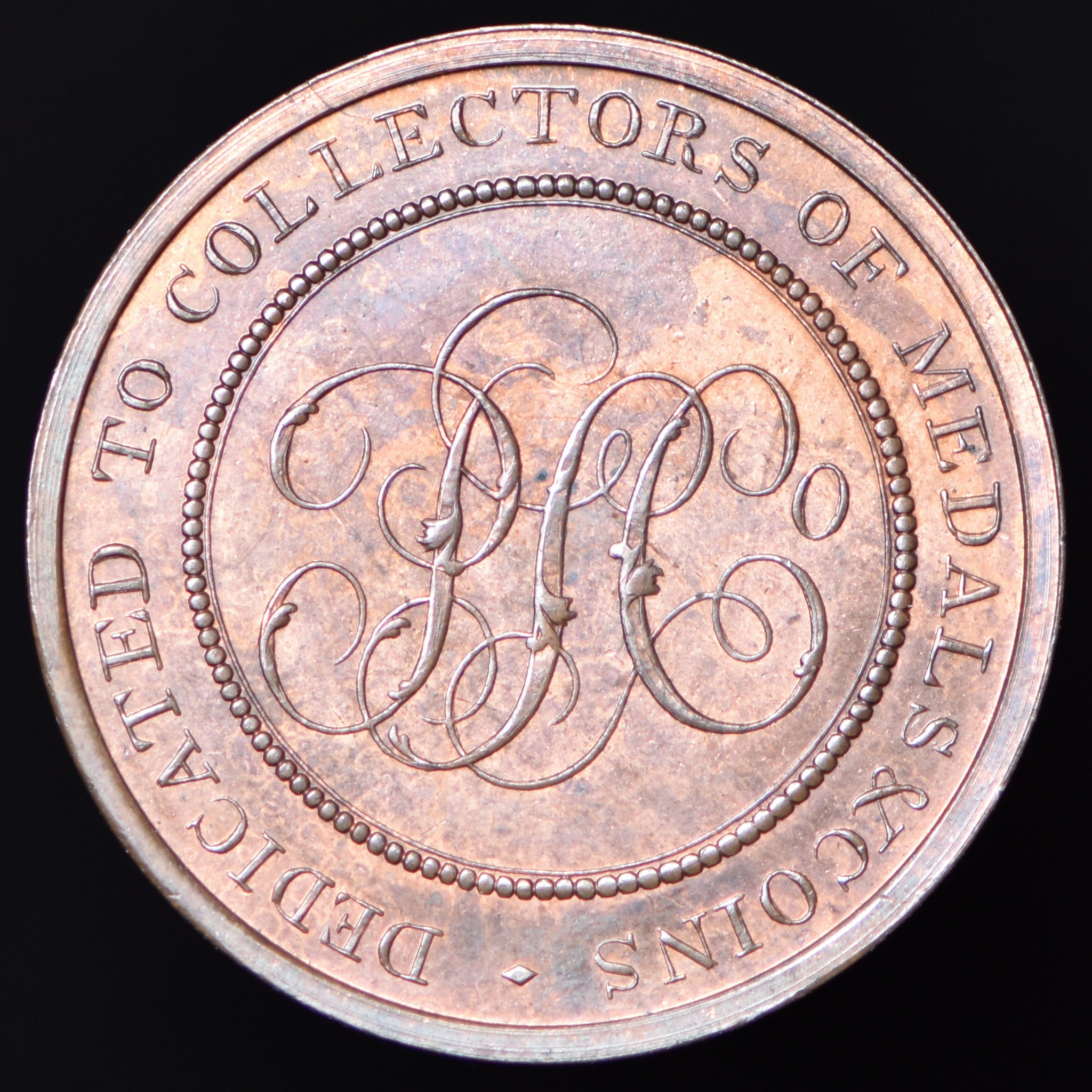 Obv: View of church, ST. OLIVE’S SOUTHWARK BT. 1739. (around), JACOBS in exergue. Rev: A cypher P S Co in center beaded circle, DEDICATED TO COLLECTORS OF MEDALS & COINS around. Edge: Plain.