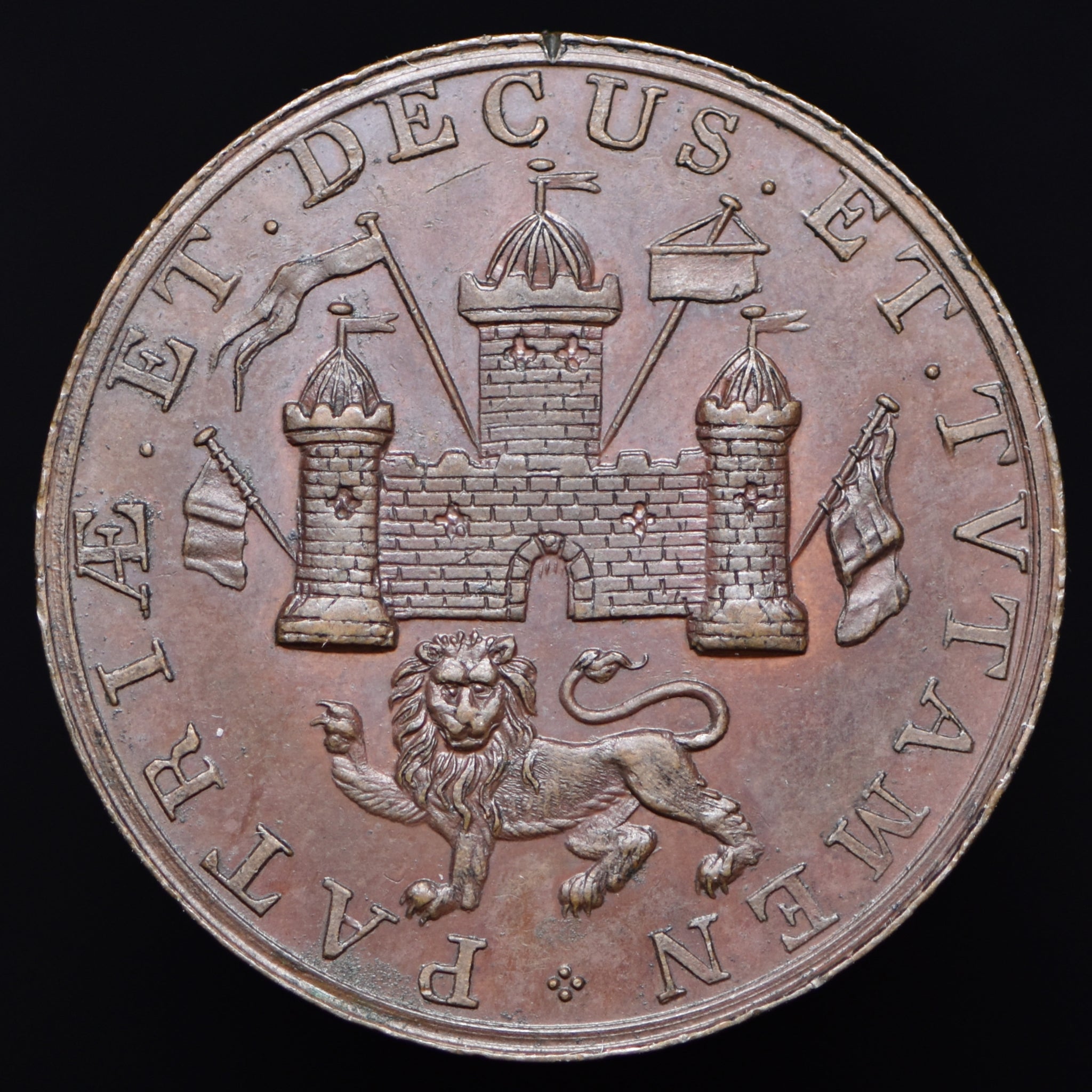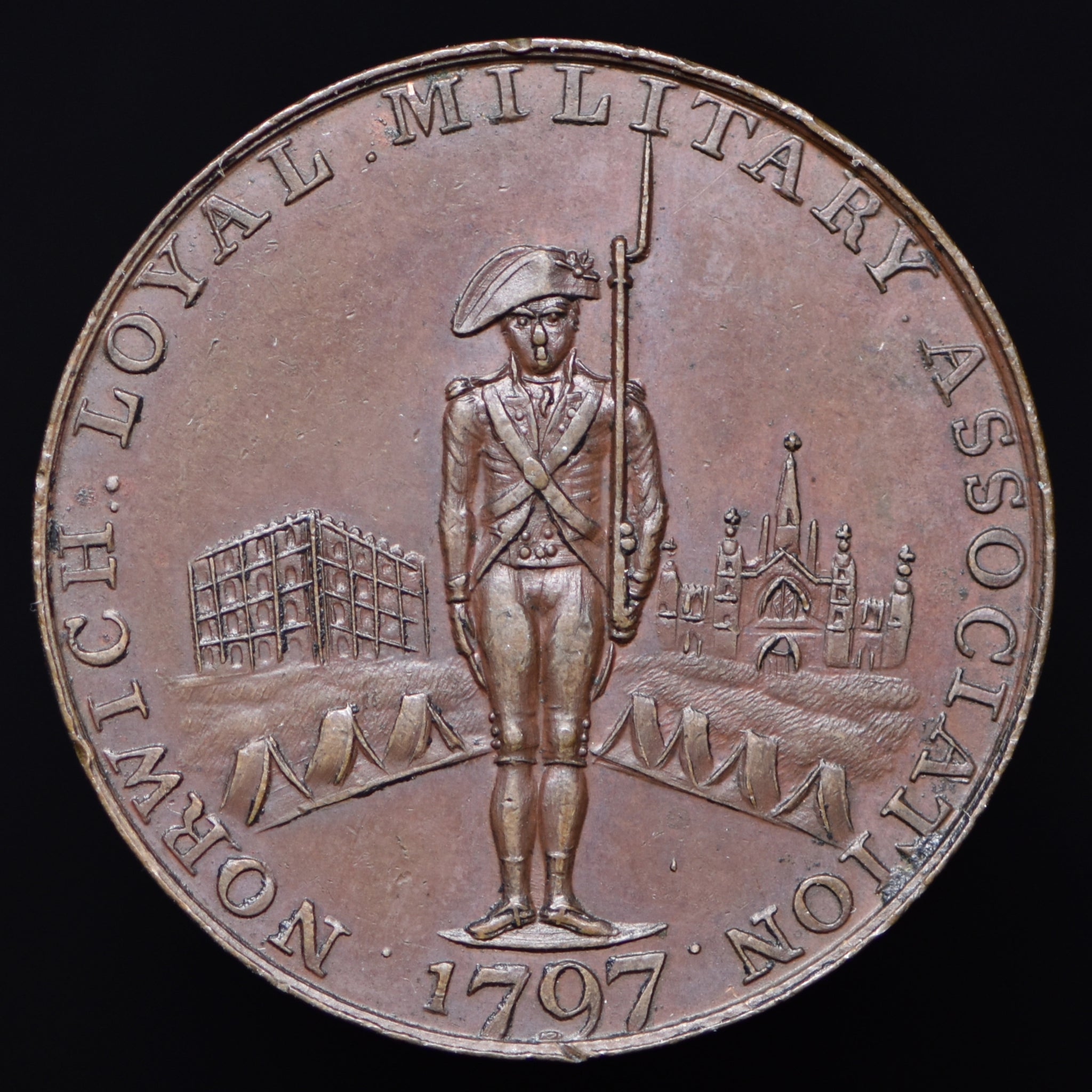 Obv: Soldier with rifle in front of row of tents, Norwich Castle and Cathedral in the distance, NORWICH . LOYAL . MILITARY . ASSOCIATION . around, 1797 below. Rev: Arms of Norwich and military ensigns, PATRIAE . ET . DECUS . ET . TVTAMEN around. Edge: Plain.