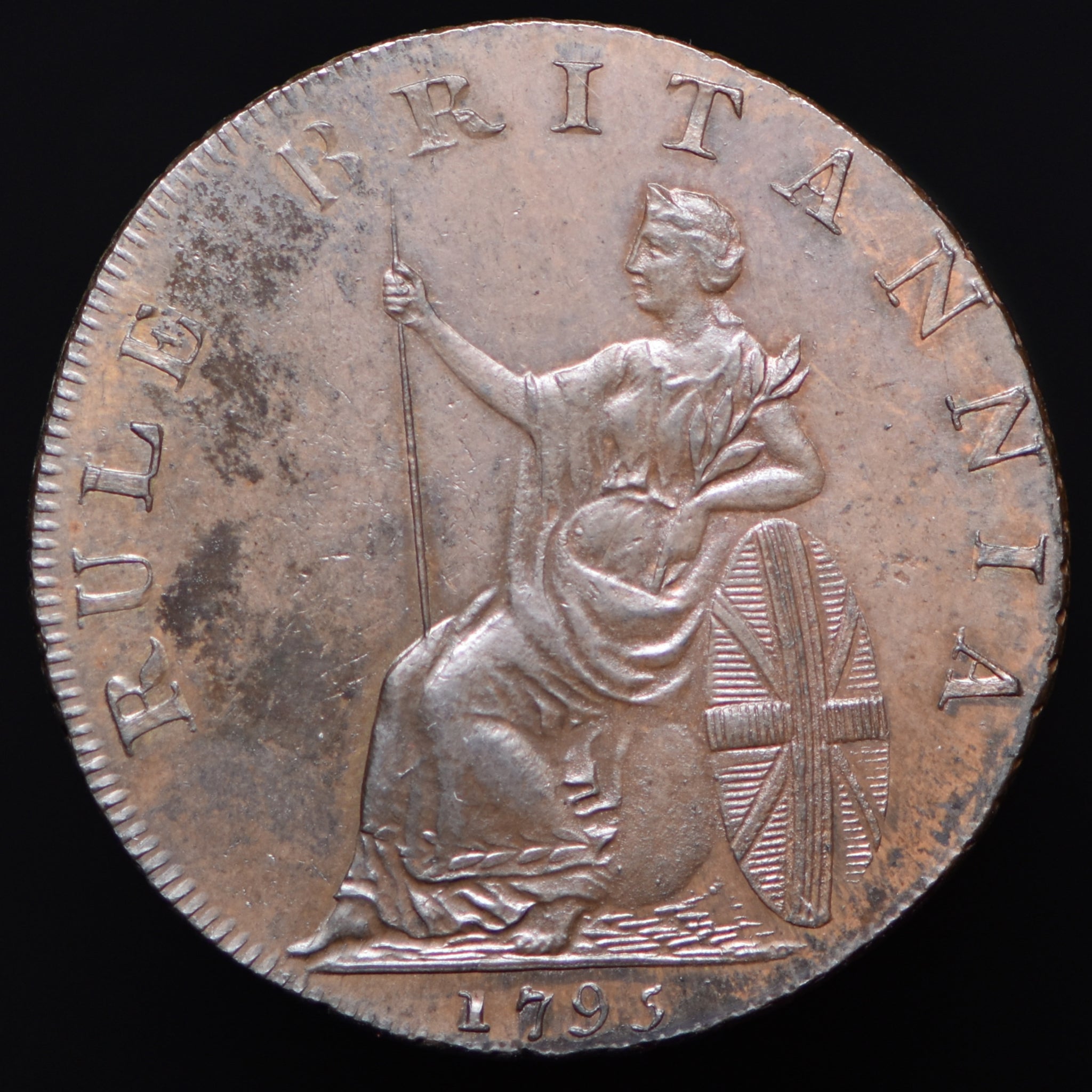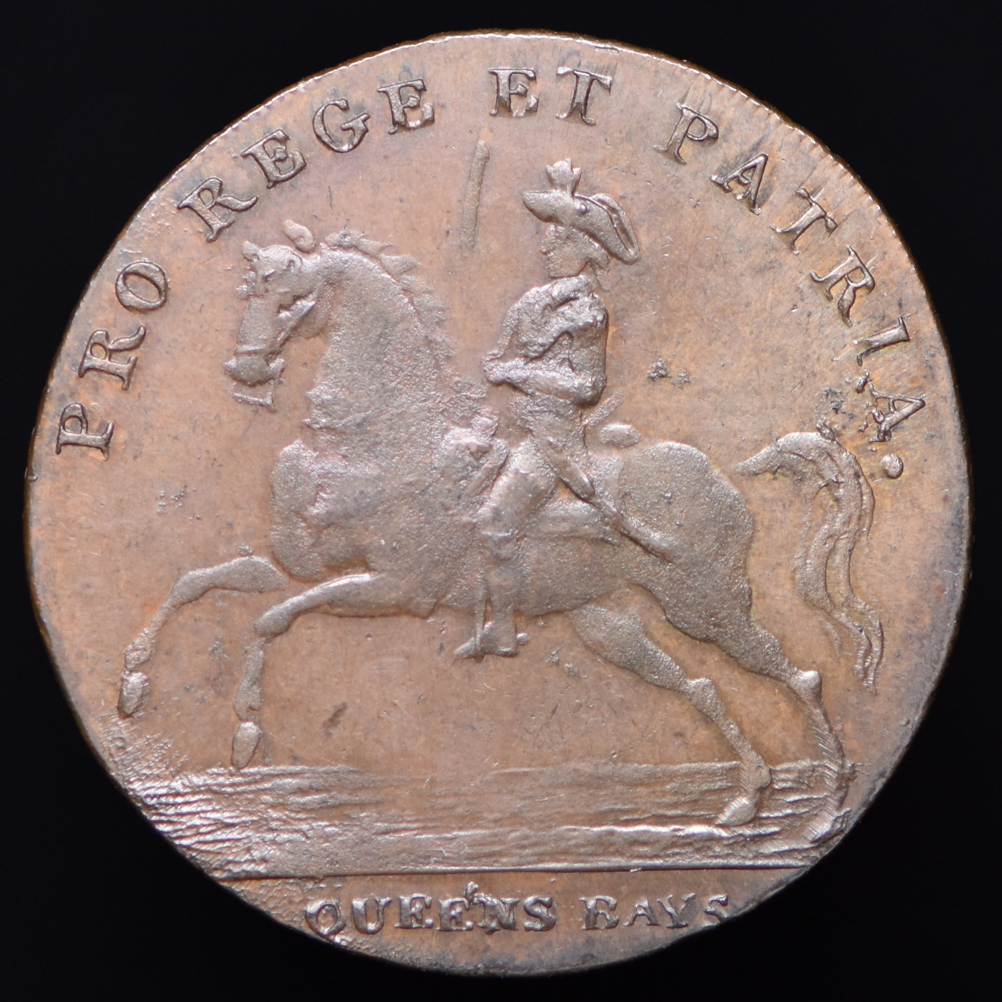 Obv: A mounted dragoon, PRO REGE ET PATRIA. (above), QUEENS BAYS in exergue. Rev: Britannia seated, RULE BRITANNIA around, 1795 in exergue. Edge: PAYABLE IN LONDON (remainder engrailed).
