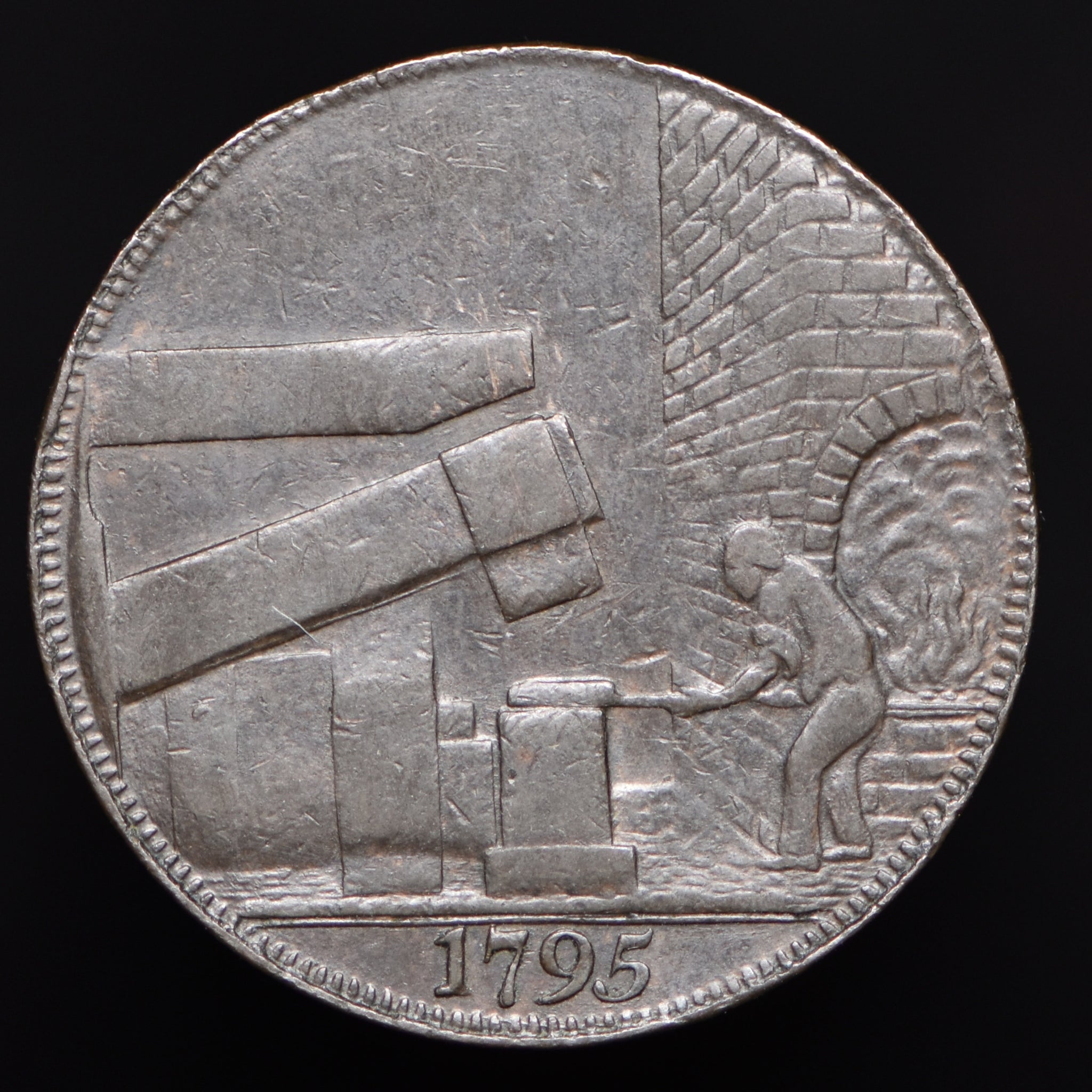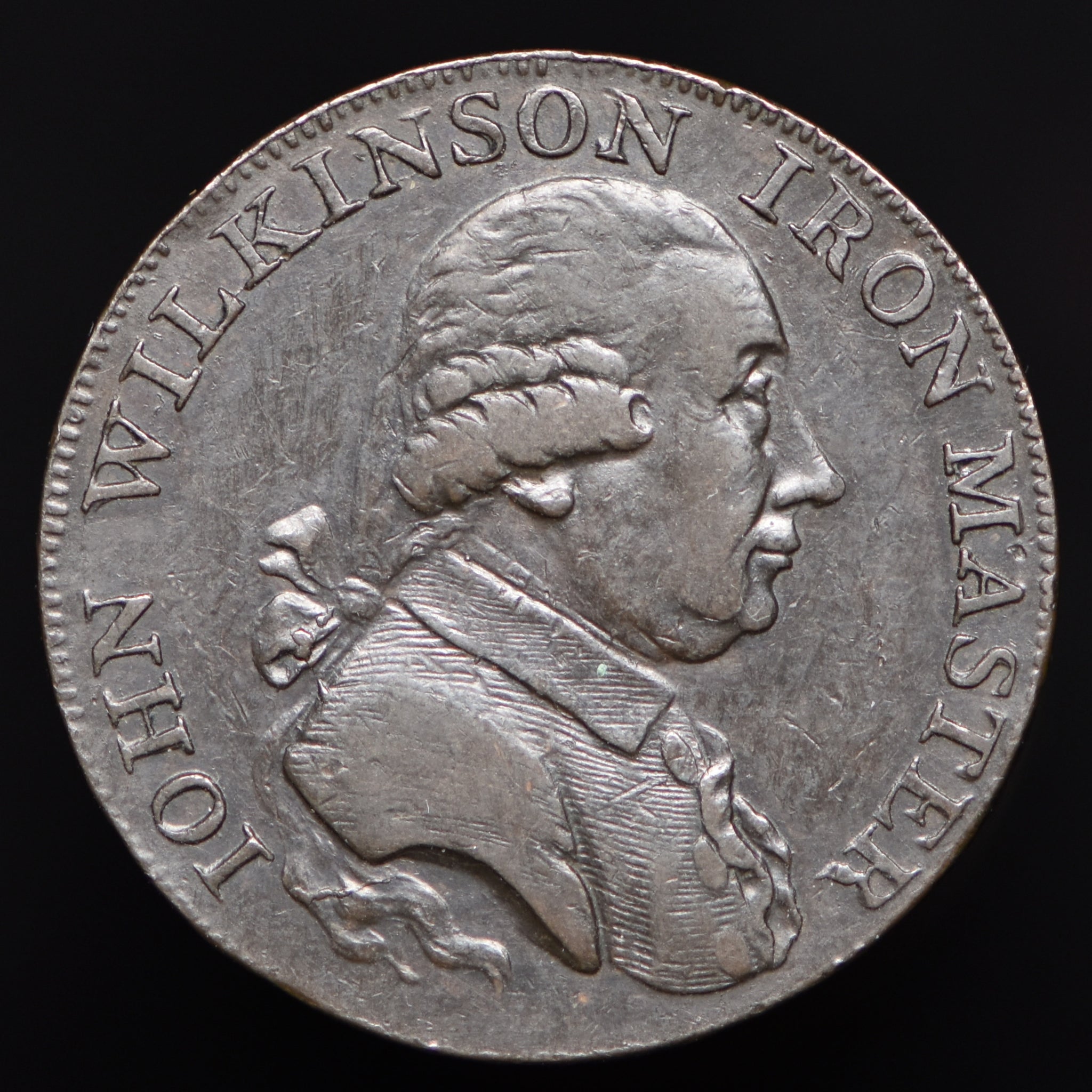 Obv: Bust of Wilkinson, IOHN WILKINSON IRON MASTER around. Rev: Man working at forge and drop hammer, 1795 in exergue. Edge: WILLEY SNEDSHILL BERSHAM BRADLEY.